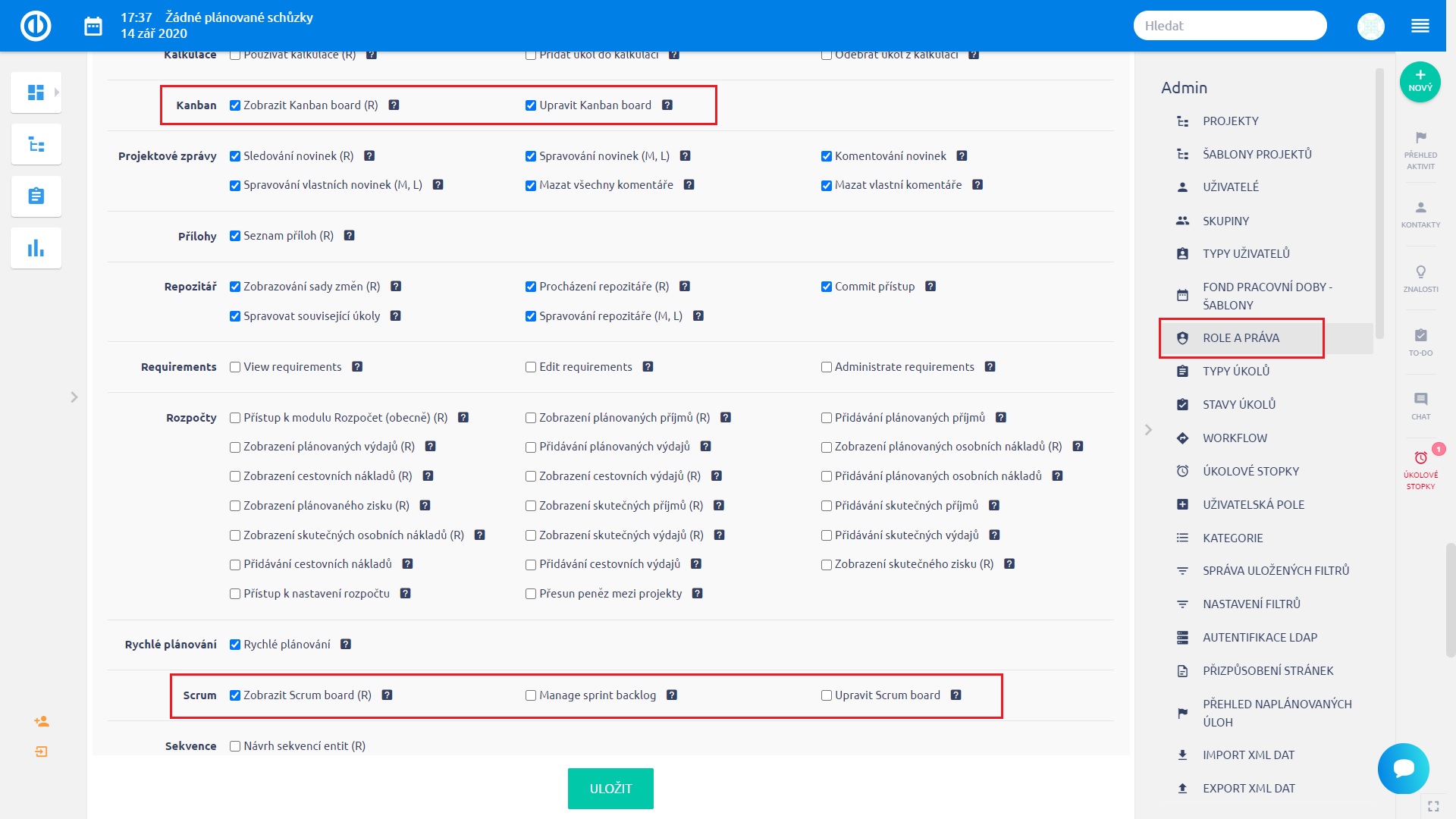 Nezbytná oprávnění, potřebná pro Scrum a Kanban nástěnky, můžete upravit v Administraci > Role a práva > Projektová práva > Kanban/Scrum. Pokud uživatel nemá dostatečná oprávnění (např. "upravit Kanban/Scrum"), jím nastavené změny budou viditelné jen na nástěnce, ale nebudou aplikovány do úkolů a po aktualizaci stránky bude vše v původním nastavení.