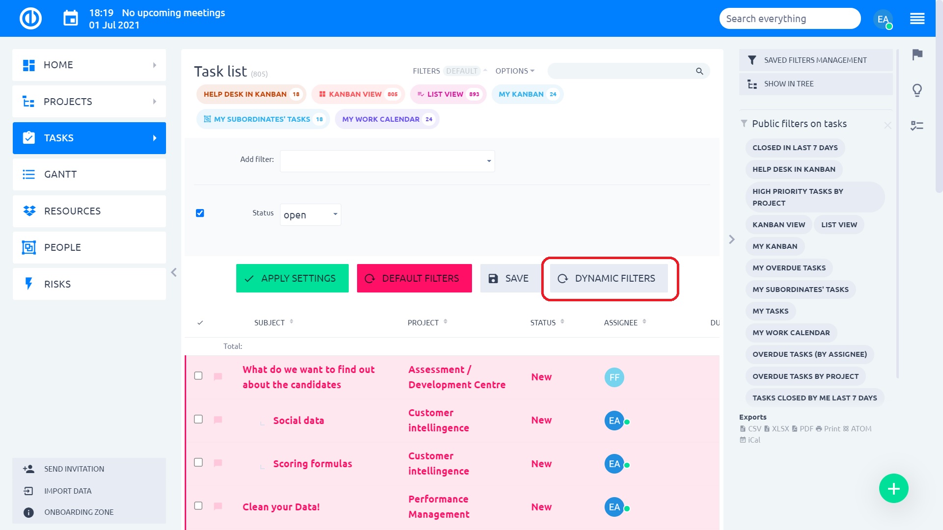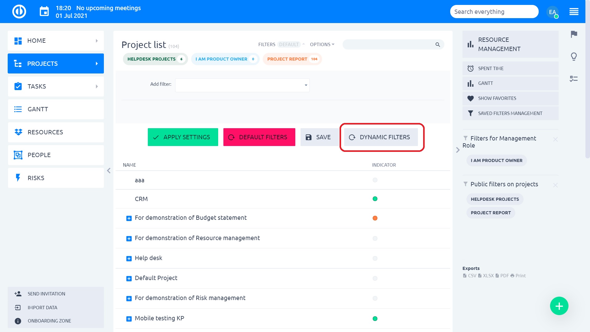 Chcete-li aktivovat dynamické filtry v seznamu projektů, otevřete seznam projektů » klikněte na „Filtry“ » klikněte na „Dynamické filtry“.