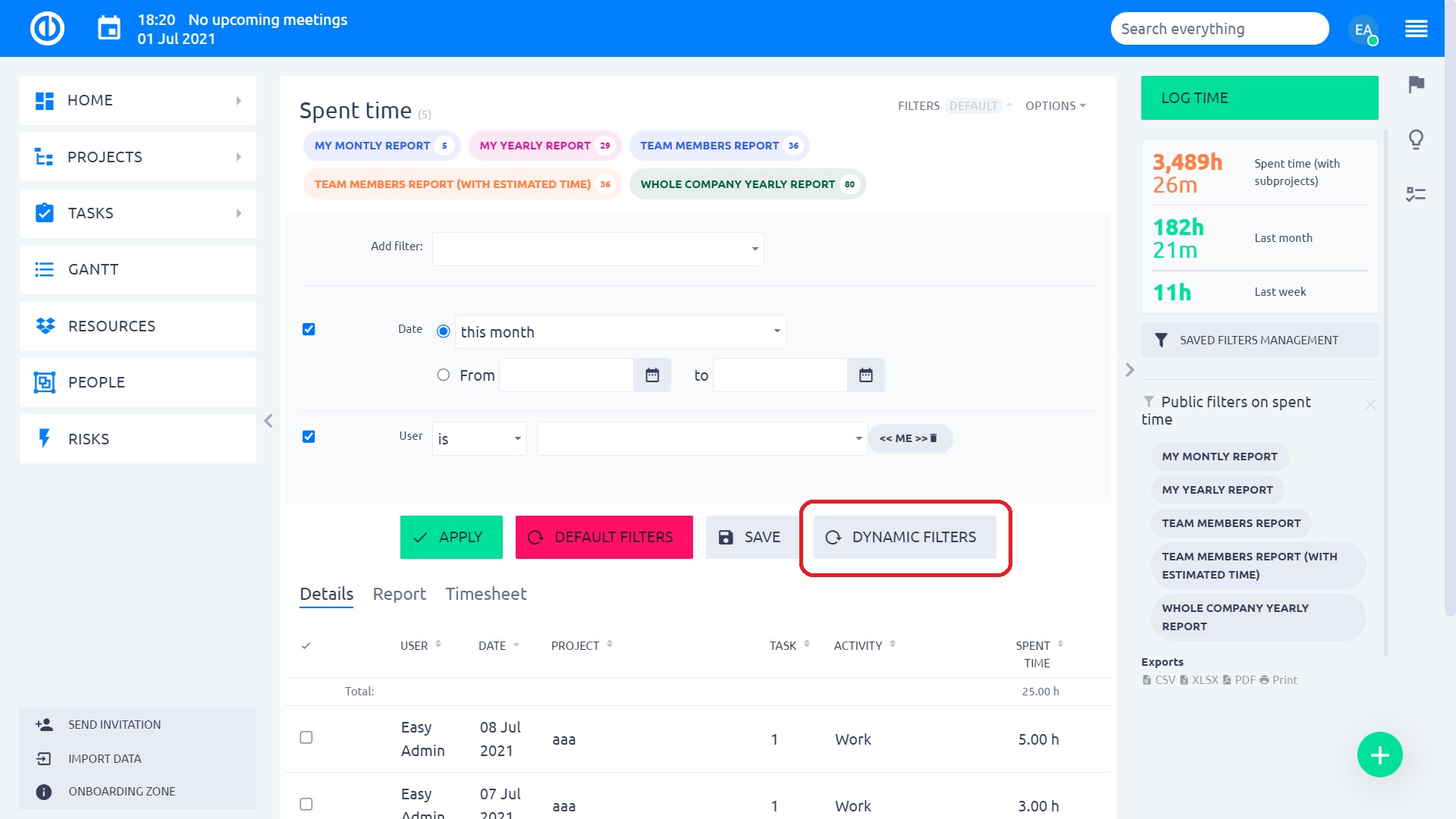 Chcete-li aktivovat dynamické filtry u záznamů odpracovaného času, přejděte do nabídky Další » Výkazy času » Odpracovaný čas nebo Osobní výkaz » klikněte na „Filtry“ » klikněte na „Dynamické filtry“.
