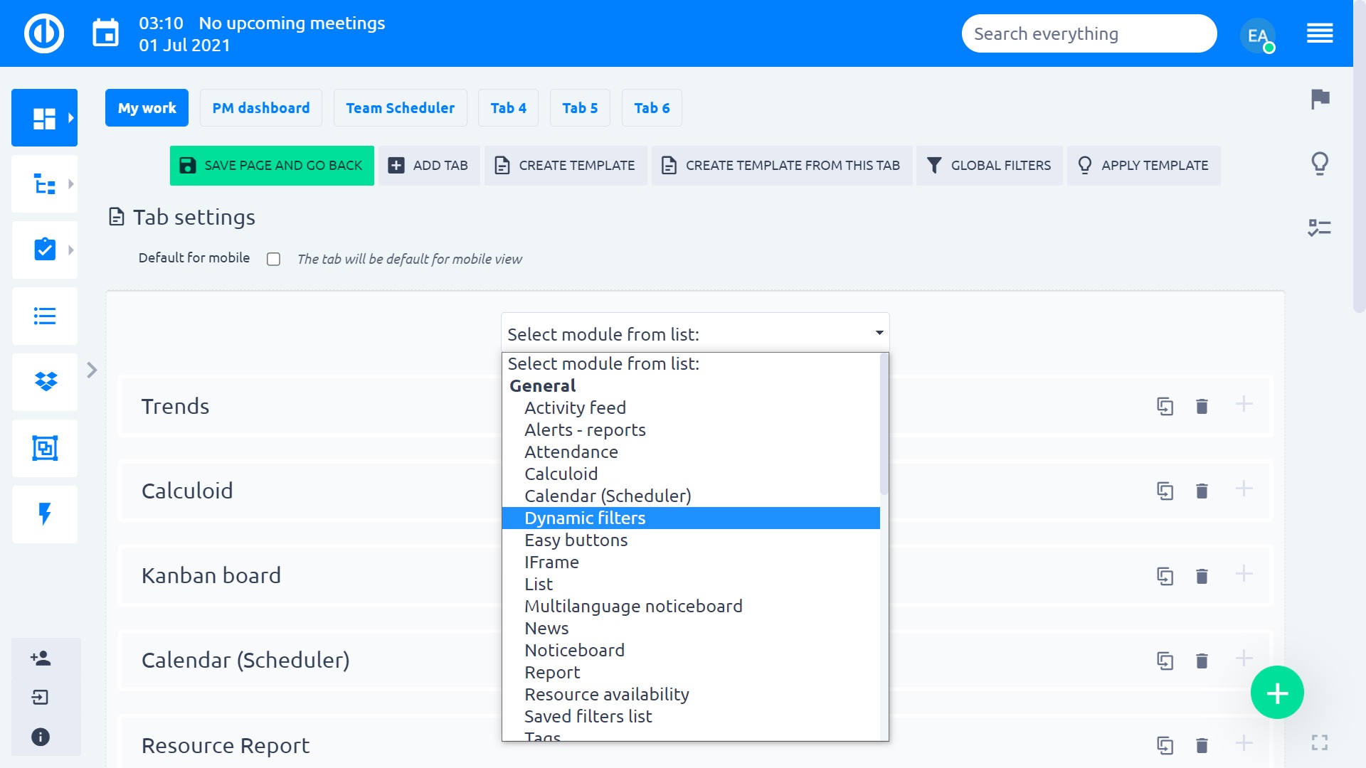 Chcete-li přidat dynamické filtry jako konfigurovatelný modul na libovolnou přizpůsobenou stránku, klikněte na tlačítko „Přizpůsobit stránku“ (ve spodní části stránky) a ze seznamu dostupných modulů vyberte modul „Dynamické filtry“.