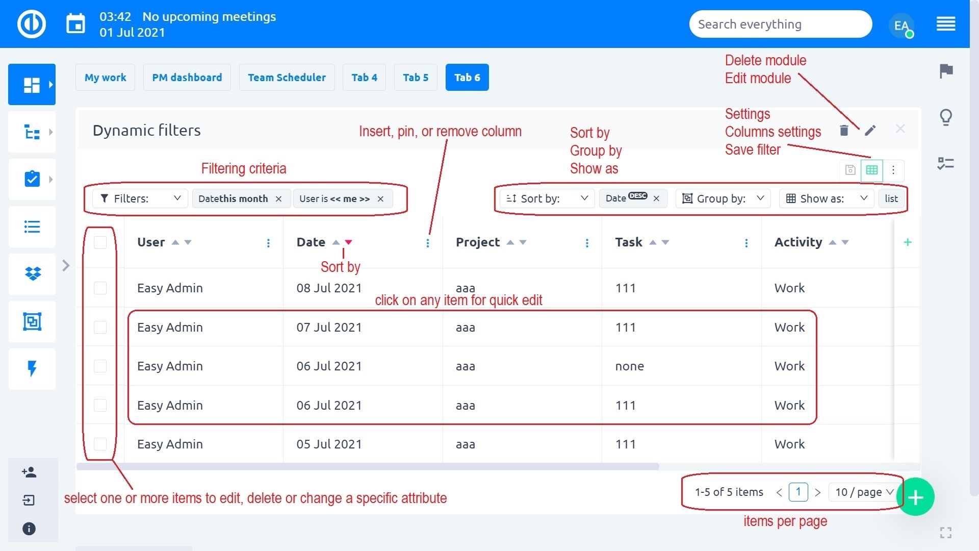 Dynamické filtry jsou nástroj, který vám umožní mnohem jednodušší procházení libovolným množstvím dat a okamžité zobrazení požadovaných výsledků, takže můžete najít své úkoly, projekty nebo zaznamenaný čas mnohem rychleji než se standardními filtry (Filtry 1.0). Dynamické filtry představují novou generaci filtrů, které můžete vytvářet, ukládat a aplikovat pouze na vybrané entity Easy Projectu, jmenovitě seznam úkolů, seznam projektů, záznamy odpracovaného času a jako konfigurovatelný modul na libovolné přizpůsobené stránce.