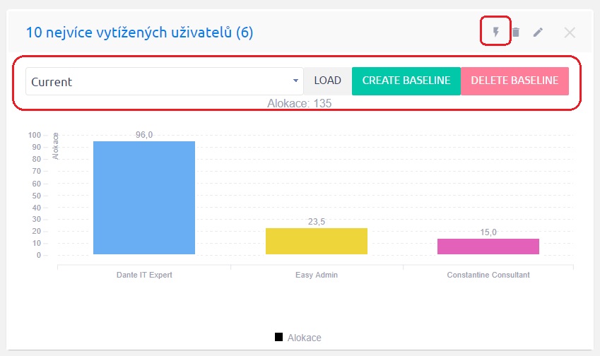 Baseline - alias základní linie - je praktická vlastnost (tvořená na základě grafů), která pomáhá ukládat průběžný vývoj grafů (provedených změn). Po přidání na jakoukoliv vlastní stránku je označena ikonou blesku, viditelnou u všech modulů grafů. Kliknutím na tuto ikonu se vám rozbalí nabídka existujících baselines a dvě tlačítka. Jedno pro vytvoření nové baseline - "Create" (po vybrání je potřeba stránku obnovit, aby se na dané stránce zobrazila). Druhé "Load" pak pro přidání už existující baseline - vyberte ho podle názvu z nabídky a klikněte na Load. Chcete-li smazat baseline, kliknete na tlačítko Odstranit hned vedle tlačítka Vytvořit.