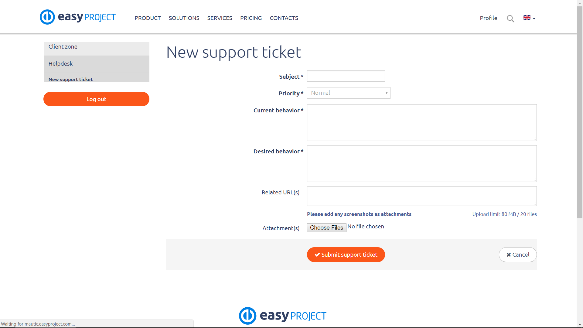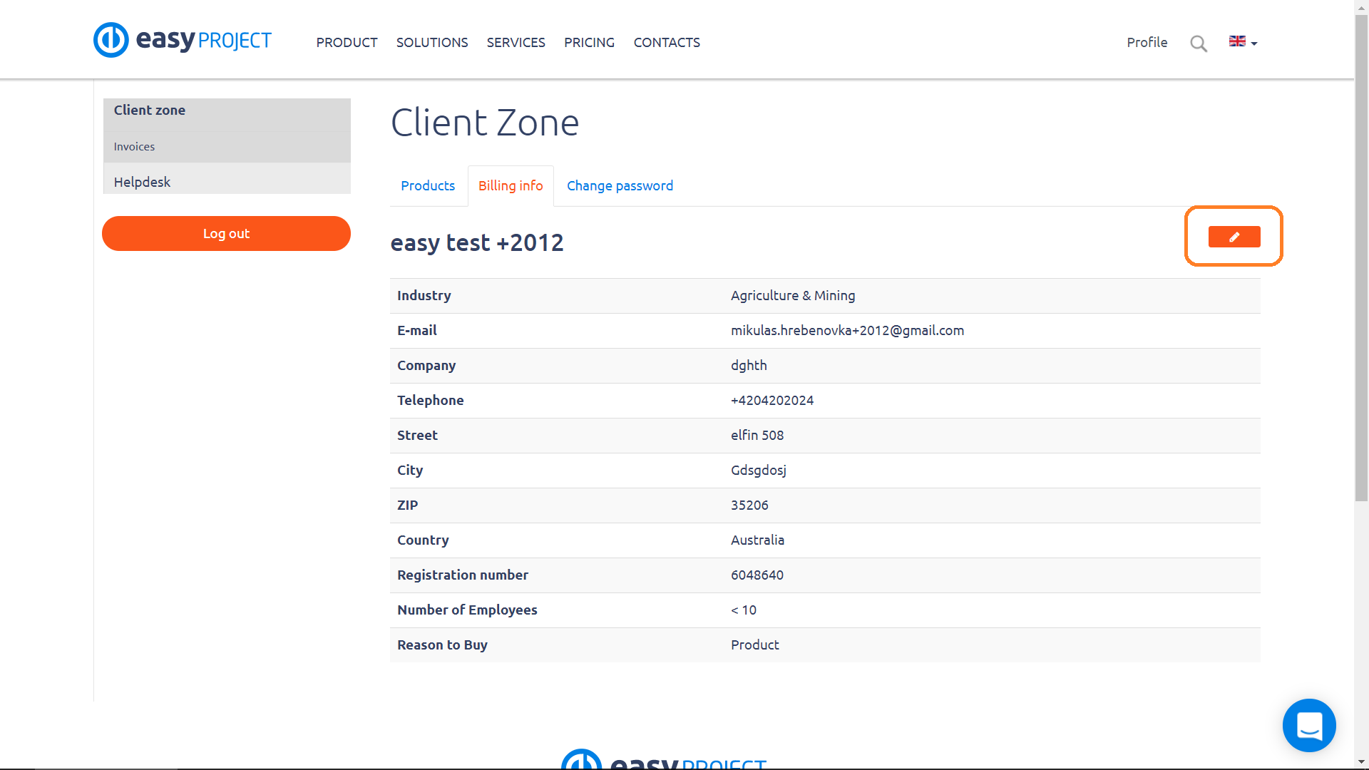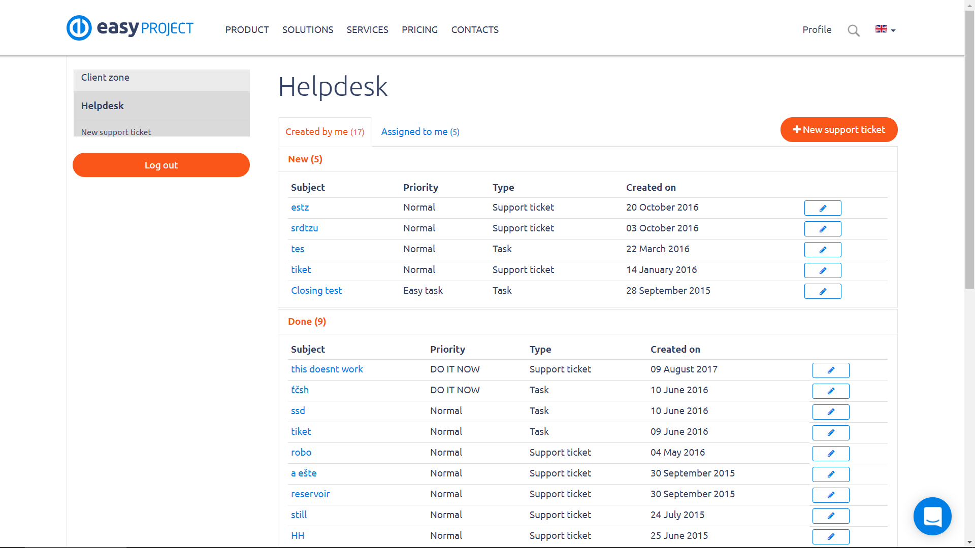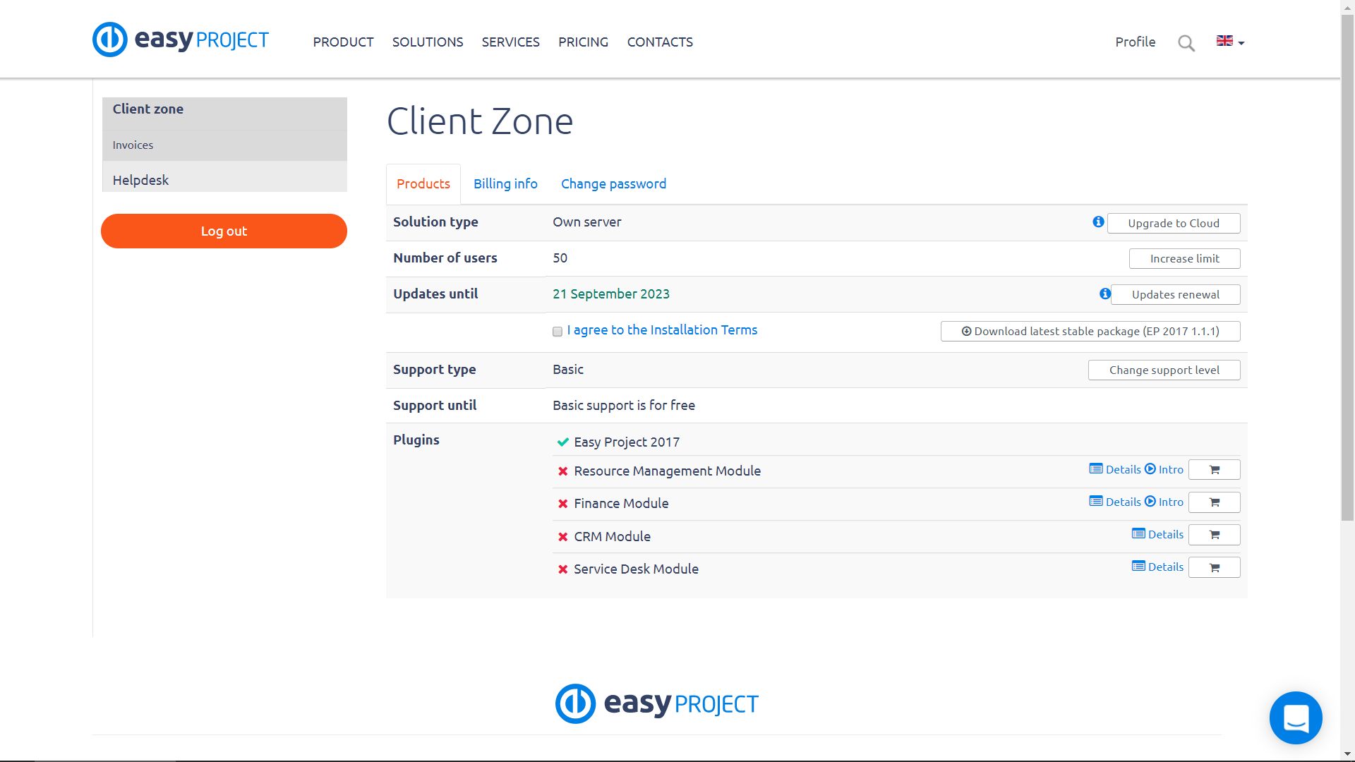 Ať už pro komunikaci s naší podporou nebo pro celkovou správu vaší Easy Project aplikace jsme vytvořili Klientskou zónu. Klikněte na odkaz "Přihlásit se" a zadejte vaše údaje. Pokud jste je zapomněli, či si své heslo nepamatujete, obraťte se na naší podporu nebo využijte link "Zapomenuté heslo".
