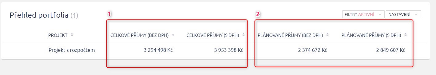 2) Plánované příjmy - Příjmy zadané v naplánovaném rozpočtu. Částka může být zobrazena včetně DPH nebo bez DPH, podle nastavení rozpočtu.