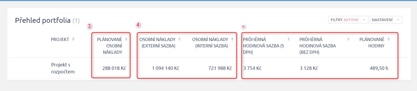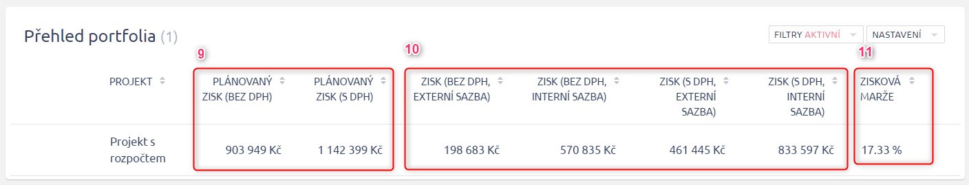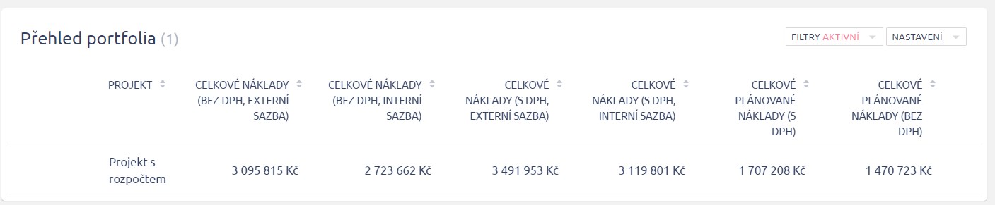 V přehledu portfolia vidíte všechny možné kombinace nákladů (s nebo bez DPH) a osobních nákladů (interní nebo externí sazby).