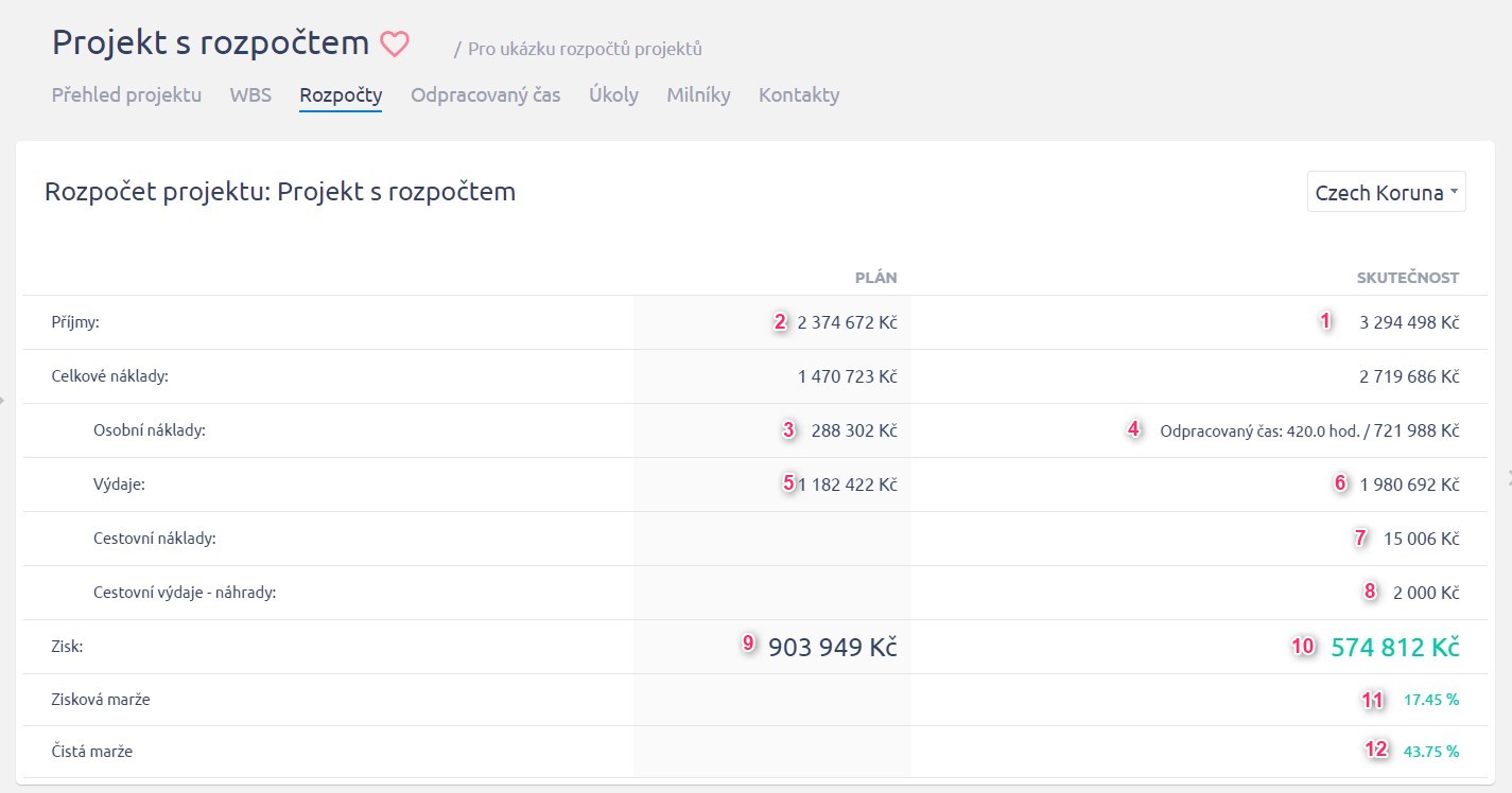 4) Skutečné osobní náklady - odpracovaný čas * hodinová sazba. Nastavení sazeb je detailně vysvětleno v příslušném článku. V projektovém rozpočtu je tato položka zobrazena podle nastavení rozpočtu.