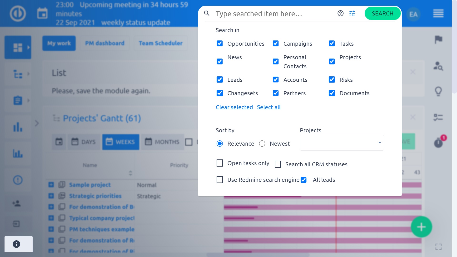 Zrychlili jsme naše vyhledávání v aplikaci využitím nové technologie Xapian a odklonem od starší verze vyhledávání v Easy Projectu. Vyhledávání je nyní více než 10× rychlejší a nabízí také přehlednější a modernější uživatelské rozhraní výsledků vyhledávání v modálním zobrazení.